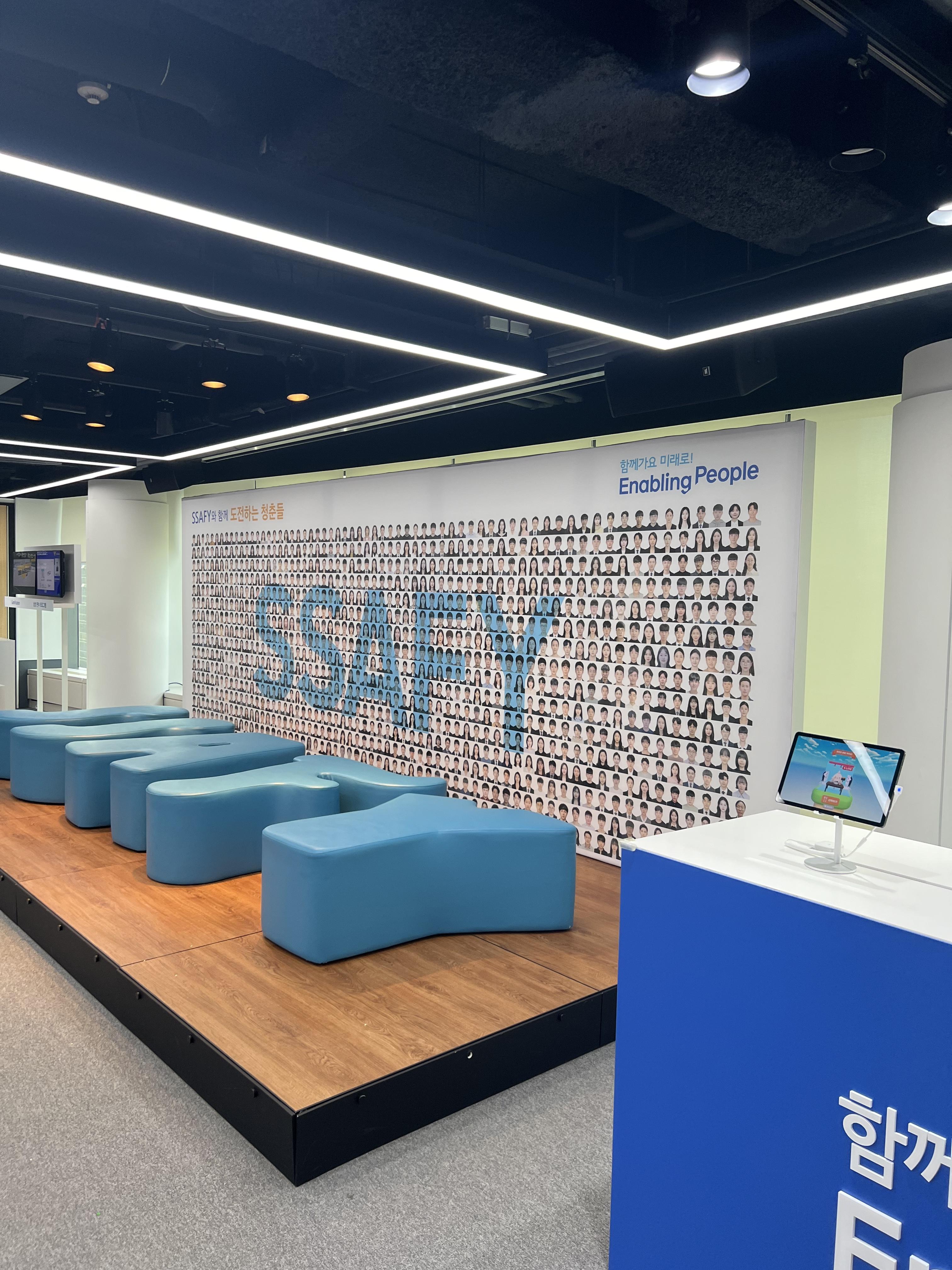 SSAFY 모양의 소파 뒤 쪽에는 싸피 수료생? 분들 사진이 있었다.